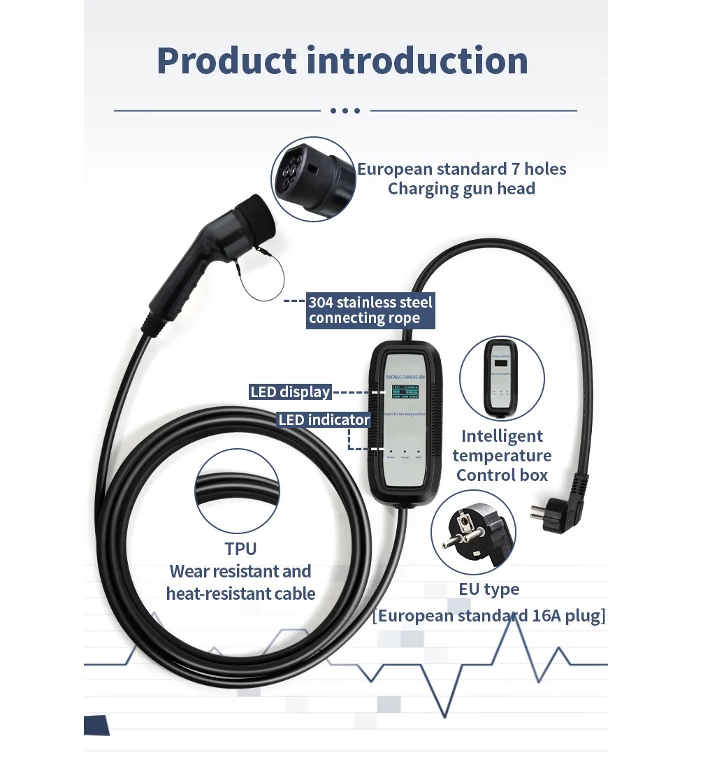 Bộ sạc di động thông minh loại 1/loại 2 tiêu chuẩn AC Châu Âu/Mỹ, vật liệu thân máy PC9330 cấp bảo vệ IP67, nhiệt độ cao hơn 85°C tự động dừng sạc, nhiệt độ dưới 60°C tự động bắt đầu sạc,
